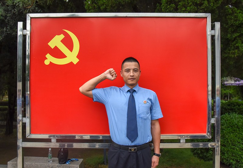 “我志愿加入中国共产党,拥护党的纲领,遵守党的章程,履行党员义务……”在抗日胜利受降纪念坊前,在机关党委书记、副检察长王新宇的领誓下,新进的预备党员及全体党员一齐向党旗庄严宣誓。