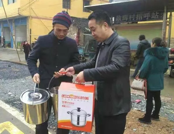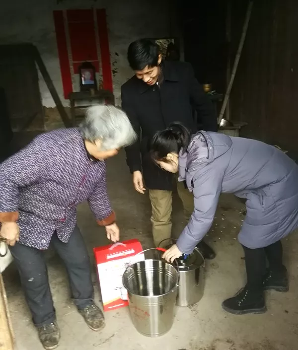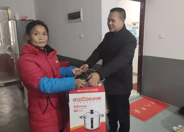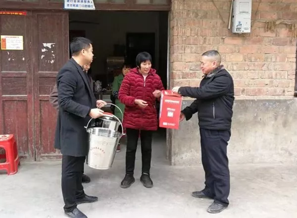 为村民们送去蒸锅、不锈钢油桶、不锈钢水桶等物资